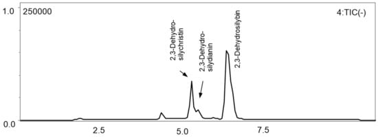 The physical properties (retention time, extinction coefficient, λmax = 255, 375 nm) of 2,3-dehydroflavonolignas differ substantially from those of flavanonols and flavonolignans. These 2,3-dehydroderivatives are minorities in silymarin and are usually not taken into account. Therefore, we have opted for an LC-MS method for their determination and quantification. We have optimized the gradient method to separate 2,3-dehydrosilybin, 2,3-dehydrosilychristin, as well as 2,3-dehydrosilydianin, which was, however, not detected in any of the silymarin samples available in the present study. Retention times of the 2,3-dehydroflavonolignans were 6.4, 5.5, and 5.3 min, respectively (Figure 3). 2,3-Dehydrosilydianin was then used as an internal standard for the quantification of 2,3-dehydrosilybin and 2,3-dehydrosilychristin in silymarin preparations (see Section 3.4.).