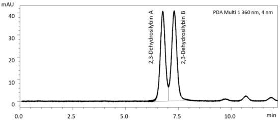 The separation of isosilychristin from silychristin is rare, isosilychristin usually migrates with silychristins A and/or B. The HPLC separation of isosilychristin from silychristin was observed previously [2,26], but separation of silychristin A and silychristin B was not achieved in these works. Similarly, AbouZid et al. separated isosilychristin and silychristin A, but silychristin B was not detected [27]. Kim et al. managed to isolate isosilychristin and silychristin A but not silychristin B using preparative HPLC [28]. Here, we present complete and baseline separation of the individual flavonolignans isosilychristin, silychristin A, and silychristin B.