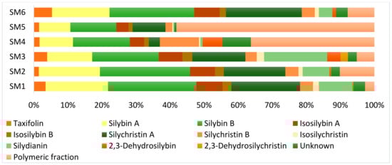 Percentage of individual components in silymarin preparations SM 1–SM 6. Individual silymarin components were quantified using calibration curves of optically pure standards isolated or prepared in house. The content of the polymeric fraction was determined as the mass difference between the content of the individual flavonoid, flavonolignans, and 2,3-dehydroflavonolignans and the mass concentration of the complex extracts.