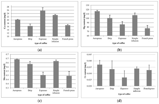 In the case of chromium (Cr), the highest content thereof was again found in Aeropress coffee (0.037 mg/L) (Figure 1d). The differences in the content of the mineral element between tested samples were statistically significant only regarding coffee from the espresso machine (vs. Aeropress, p = 0.0001; vs. drip, p = 0.0077; vs. simple infusion, p = 0.0039; vs. French press, p = 0.0232).