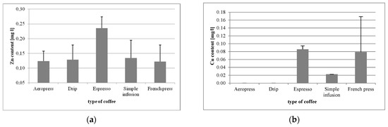 In the analysis of copper (Cu) levels, it was demonstrated that coffee from the espresso machine was the best source of that mineral (0.085 mg/L), whereas in Aeropress and drip brews its levels were below the detection limit (Figure 2b). Statistically significant differences in Cu levels were found in Aeropress vs. espresso (p = 0.000129), Aeropress vs. simple infusion (p = 0.0072), drip vs. espresso (p = 0.0001), drip vs. simple infusion (p = 0.0072), espresso vs. simple infusion (p = 0.0017), and in French press vs. simple infusion (p = 0.0276).