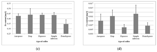 The highest content of cobalt (Co) was determined in the coffee made by simple infusion (0.012 mg/L), and the lowest in coffee from the espresso machine (0.006 mg/L) (Figure 2d). The differences were statistically significant for the following coffee preparations: espresso vs. drip (p = 0.00039), simple infusion vs. Aeropress (p = 0.0494), simple infusion vs. espresso (p = 0.000136), French press vs. drip (p = 0.002342), and in French press vs. simple infusion (p = 0.000271).