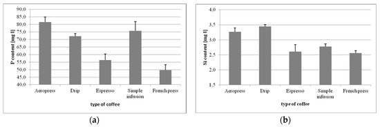The lowest levels of phosphorus (P) were observed in the coffee from the French press (49.64 mg/L), and the highest in the Aeropress coffee (81.58 mg/L) (Figure 3a). The differences between the respective coffee preparations were statistically significant, except for the difference between drip and simple infusion (p = 0.2176).