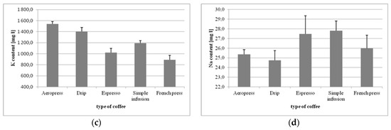 In the case of sodium (Na), the highest levels were found in coffee made by simple infusion (27.810 mg/L), and the lowest were found in the drip brew (24.736 mg/L) (Figure 3d). Statistically significant differences in Na content were found for Aeropress vs. espresso (p = 0.00159), Aeropress vs. simple infusion (p = 0.0003), drip vs. espresso (p = 0.0002), drip vs. simple infusion (p = 0.0001), espresso vs. French press (p = 0.0421), and simple infusion vs. French press (p = 0.0076).