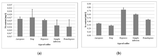 Nutritional requirements or RDA for nickel have not been established. The role and adverse health effects of nickel and nickel compounds have been assessed by several authors [32,33,34], but the role of nickel in the physiology of living organisms has not been fully explained. Most likely, Ni in animals and humans participates in erythropoiesis by influencing vitamin B12 metabolism and is regarded as a trace element in nutrition. Although there have been no reports in the literature to date on nickel deficiency, it is good to remember that nickel-rich foodstuffs include lentils, cocoa, chocolate, and nuts [35]. The daily intake of nickel from the average diet is about 150 μg, which corresponds to 2.5 μg/kg body weight per day in a 60 kg adult. Consumption of foods with a high nickel content and additional exposure from first-run drinking water and kitchen utensils may result in intake higher than the critical dose of this substance [21]. In terms of epidemiology, the most critical nickel-related issue to human health is nickel allergy. In those with a strong response, dermatitis may be caused by oral administration of 300 µg of nickel. This amount corresponds to doubled daily intake of this element [35]. In our study, Ni levels determined in coffee beverages made using different methods were more or less on a par. Two cups of coffee could supply about 6.5% of the daily intake of this element.