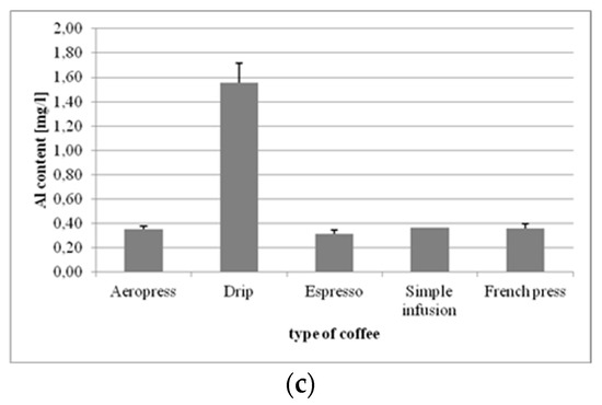 Some of the minerals supplied to the body with the diet are required in large amounts to ensure normal body function (e.g., Ca and Mg), whereas others, such as Cu, Zn, K, Na, Fe, Cr, and Co, are only needed in small concentrations. However, there are also some elements, for example, strontium or aluminum, whose functions in the body are unknown [28]. In the case of toxic elements, their content in the diet should preferably stay below certain levels, due to the risk of adverse effects in response to excessive exposure. The presence of aluminum in soil is a natural phenomenon, but current studies suggest that the natural environment is significantly exposed to elevated levels of this mineral [29], whereas excessive accumulation of aluminum in brain tissue manifests itself primarily by memory deficit and posture dysfunction [29]. Vegetables cultivated in areas contaminated with heavy metals may include large amounts of aluminum, but it seems that the main source of human exposure comes from the public water supply [29,30]. For the general population, the intake of aluminum from food is 7.2 mg/day for females and 8.6 mg/day for males on average [31]. According to our findings, drinking two cups of coffee with the highest Al content, this being the drip brew (1.55 mg/L), supplies 0.55 mg of the mineral, and so the beverage does not constitute a significant source of aluminum in daily diet.