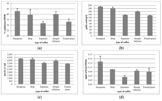 The lowest total polyphenol content was found in the coffee from the French press (133.90 g gallic acid/L) and the highest was observed in the Aeropress brew (191.29 g gallic acid/L) (Figure 5b). The differences between the respective coffee brews were statistically significant, except for the difference between the coffee from the French press vs. espresso (p = 0.4733).