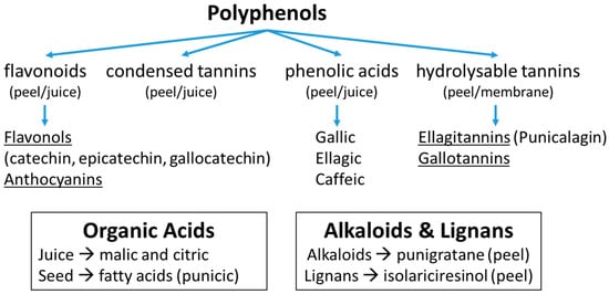 Major polyphenols, organic acids, alkaloids, and lignans of the pomegranate fruit.