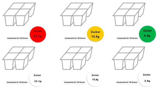 A balanced, healthful diet is one of the most important factors that contributes to staying healthy and avoiding all kinds of diseases. Yet, 39% of adults of the world population are overweight or obese and thus more at risk for developing cardiovascular diseases, diabetes, and certain types of cancer [1]. One of the major causes for overweight and obesity is an increased consumption of high-energy foods, which contain a lot of fat or sugar. Thus, preventing overconsumption of sugary and fatty foods is substantial to facilitate healthier nutrition throughout the population. Accordingly, various health campaigns label processed food products in a way that allows consumers to assess important dietary information about the products. One popular approach, already practiced in the UK, is to place traffic light nutrition labels on food items. The traffic light labels indicate the levels of four key nutrients (i.e., fat, sugar, saturates, and salt) commonly contained in processed food, with red indicating a high level, amber a medium level, and green a low level of the respective nutrient. The purpose of the traffic light system is to advise consumers against choosing products with a high amount of these ingredients and thus assisting them in making healthier food choices [2]. However, research findings are inconclusive regarding the system’s effectiveness [3,4,5,6,7,8,9].