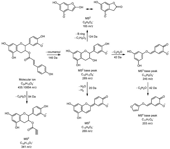 Compounds 43 (4.14 min and 451 m/z) and 46 (4.81 min and 451 m/z) with the same fragmentation pathway were identified only in grape seed, as (epi)catechin hexoside isomers. Both compounds generated MS2 base peak at 289 m/z, corresponding to deprotonated catechin or epicatechin. It is interesting to note that some compounds that are not common for Vitis species, such as chalcan-flavan dimers, were found in wine and grape seed samples. Two isomers of chalcan-flavan-3-ol (compounds 51 and 58, molecular ion at 579 m/z) with same fragmentation pathway were identified at 5.07 and 5.59 min, respectively, and their fragmentation was in accordance with literature data [28]. Compound 65 at 8.12 min and molecular ion 435 m/z was marked as (epi)catechin 3-O-coumarate. It produced MS2 base peak at 289 m/z and further fragmentation confirmed that this was an ester of catechin and coumaric acid (Figure 1). These compounds were already isolated and identified in green tea extracts [29], and as far as we know, they have not been identified in some Vitis species until now. In this study, it was found only in grape seeds extract of the autochthonous grapevine variety Vranac. A very similar fragmentation pattern was noticed for (epi)catechin 3-O-vanillate (64) and it was recently identified in grape seed and red wine by Ma et al. [30].