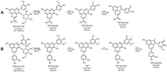 Fragmentation pathway of (A) peonidin 3-O-hexoside-pyruvate (4’) and (B) malvidin 3-O-hexoside-4-vinylcatechol (24’) in positive ionization mode.