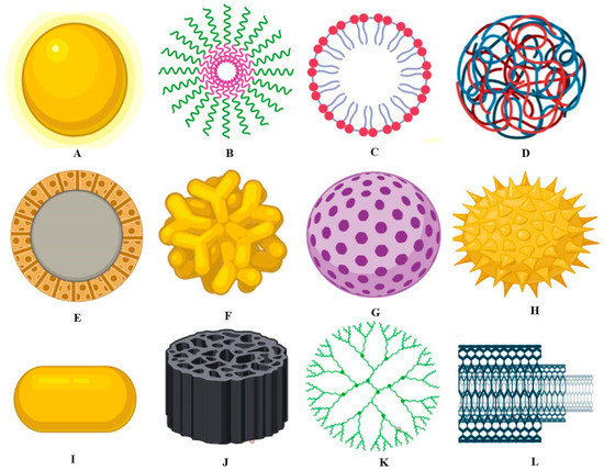 Graphical representation of different types of nanomaterials used in the food industry. (A) Metallic nanoparticles, (B) Polymeric micelle, (C) Liposomes nanoparticles, (D) Polymeric nanoparticles, (E) Solid-core mesoporous nanoparticles, (F) Branched gold nanoparticles, (G) Mesoporous nanoparticles, (H) Surface functionalized nanoparticles, (I) Nanorod, (J) Porous silica nanoparticles, (K) Dendrimer, (L) Carbon nanotubes.