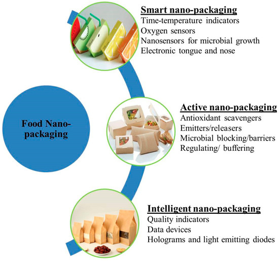 The smart packaging of food constitutes active and intelligent packaging. Active packaging generally enhances the shelf life, and maintains and improves the packaged food. Bioactive packaging provides a positive impact for the health of consumers with the production of packaged foods which are good for health [73]. A wide range of nanoparticles have antimicrobial effects and have attracted a great deal of attention in a series of applications in food packaging. Metal nanoparticles have been incorporated in polymer films of metal nanocomposites in a new generation of nano-food-packaging, which is based on the antimicrobial active packaging of food products; for example, silver nanoparticles are used for food packaging as an active system due to their antimicrobial activity [74]. The most basic commercial applications of nanotechnology are in food packaging in the food industry. The incorporation of nanomaterials in food products improves the packaging properties including the flexibility as well as gas barrier properties, which is the most important application of nanotechnology in the food industry [75]. Active packaging includes nanoparticles with antimicrobial and oxygen scavenging activities, smart packaging, and intelligent food packaging, including nanosensors which are intended to sense microbial as well as biochemical alterations and provide signals [76].