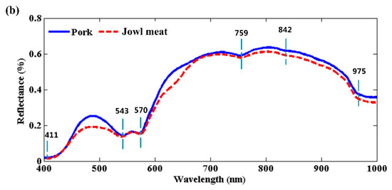 In the VNIR region, several downwards peaks (absorbance bands) could be observed for pork and jowl meat. The band centered at around 411 nm was associated with the Soret absorption band, which was due to a respiratory pigment of haemoglobin [37]. The valleys of 543 nm and 570 nm can be ascribed to the presentence of deoxymyoglobin and oxymyoglobin, respectively [38], which were responsible for color traits of meat. The 975 nm and 759 nm were attributed to the second and third overtone of O–H stretching mode of water, respectively [39,40]. As for a weak reflectance valley, the independent absorbance band of 842 nm could correspond to the C-H stretching mode of aliphatic compounds [41,42]. The comparison showed that the reflective differences at these bands indicated that minced jowl meat samples had more contents of myoglobin, fat, and water than pure pork. Thus, the identification of jowl meat adulteration in pork is preliminarily concluded to be feasible on the basis of its spectral characteristics difference.