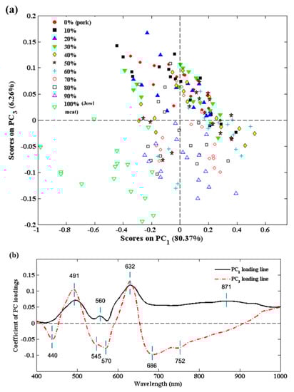 Principal component analysis (PCA) is an efficient chemometric method, which provides the interpretation of variances among different data points in spectral analysis. In order to compare and highlight the spectral similarities and differences, PCA was first applied to the whole dataset of 176 spectra. The first three PCs which individually accounted for 80.37%, 9.50%, and 6.26% of the total variance were retained. The reason was that above 95% of the variation could be explained by the first three PCs. Moreover, through trial and error with different PC combinations, PC1 and PC3 were found to be useful in grouping samples into different adulteration levels. Then, the calculated PC scores of data points for different adulteration levels were utilized to create a 2D score plot (Figure 2). In general, data points in the same adulteration level tended to gather together and will be separated from others. The score plot of the combination of PC1 vs. PC3 is shown in Figure 2a. As the adulteration level continued to rise, corresponding samples tended to move along the positive directions of PC1 axis and PC3 axis. However, in low-level adulteration (less than 30%), data clusters were observed to be quite close and overlapped in a certain level. Tracing the root of the above observation, the main chemical composition of homologous pork and jowl meat was too similar so that no distinct separation was displayed if adulteration level was low. In addition, PC2 seemed to mainly express the mutual information of samples with different adulteration levels, which was eliminated in the discrimination.
