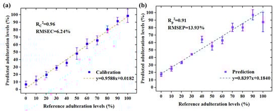 The performance of the preferred multispectral RC-PLSR model with error bar is illustrated in Figure 5. The results of this optimal model were visualized, and it could be seen that all the adulterated samples could be detected (predicted values were above 0%) whether in the calibration or prediction set. The LOD in independent prediction set calculated by the above Equation (2) was found to be 6.50%. However, the aim of meat adulteration is generally to make profit so that adulteration is always performed to be more than 10% [44]. Thus, the LOD in this research proved that it was competent in detecting jowl meat adulteration in pork by the HSI system.