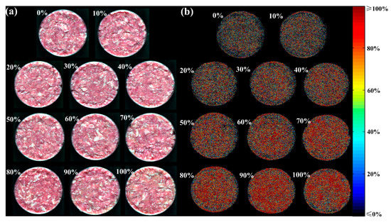 Distribution maps of jowl meat adulteration in pork at pixel level. (a) False color images, (b) Distribution maps.