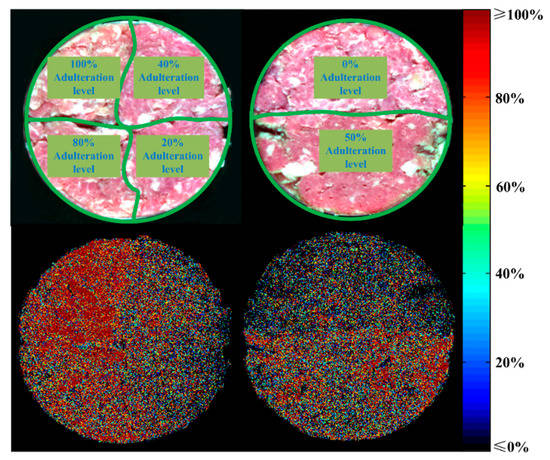 Recognizing adulterate distribution in minced pork is helpful to rapidly observe general adulteration level or if the sample was adulterated. The generation of distribution map is a means of visualization. It is a special advantage of HSI that conventional imaging or NIRS could not achieve. The optimal simplified model can be applied back to predict values in each pixel in the multispectral images at selected wavelengths. After that, the distribution map which pieced all predicted values of pixels together is generated. Therefore, in this research, after the optimal simplified model was confirmed, a colorful image with a linear color scale used for visualizing adulteration levels was displayed. All these steps were performed using a homemade program developed in Matlab 2013b.