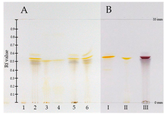 High-performance thin-layer chromatograph (HPTLC) of (A) methanolic crude extracts of C. (D.) spec. (1), C. (D.) austronanceiensis (2), C. (D.) icterina (3), C. (D.) icterinula (4), C. obscuro-olivea (5), C. viridulifolius (6) and (B) reference compound skyrin (6, I), endocrocin (3, II), and hypericin (5, III) (mobile phase: toluene, ethyl formate, and formic acid (10:5:3; v/v/v) distance from application line to solvent front: 55 mm).