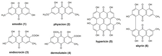 In the literature, about 700 anthraquinone derivatives are described, in which emodin, physcion, catenarin, and rhein are the most frequently reported [9,10,11]. Two hundred of these are described for flowering plants, which also occur in edible plants and vegetables such as Rheum, Aloe and Cassia species, while the remaining ones are produced by lichens and fungi [7,8,12].