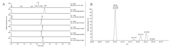 (A) Extracted ion chromatograms (EIC, mass window: 25 ppm) of anthraquinones 1-6 from crude extract of Cortinarius (D.) austronanceiensis, (B) Extracted ion chromatogram (EIC) of dermolutein (3, m/z 327) acquired during DESI-HR-MS measurement of methanolic extract from C. (D.) austronanceiensis.