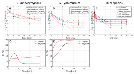 Cell density (log10(CFU/cm2)) of the 1- (black) and 7- (red) day-old L. monocytogenes, S. Typhimurium, and dual-species model biofilms as function of the CAP treatment time using an air-based cold atmospheric plasma (CAP) system (n = 3). Both the experimental data (symbols) and the global fit (line) of the Geeraerd et al. [25] model are represented. For the single-species (A) L. monocytogenes and (B) S. Typhimurium biofilms: total viable population on general medium (o, solid line) and uninjured viable population on selective medium (x, dashed line). For the (C) dual-species biofilm: total population on general medium (o, solid line), L. monocytogenes population on PALCAM medium (x, dash-dot line), and S. Typhimurium population on XLD medium (◊, dashed line). The percentage of sub-lethally injured cells (SI) as function of the CAP treatment time have been included as well for the (D) L. monocytogenes and (E) S. Typhimurium single-species model biofilms.