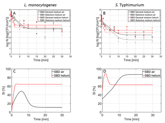 Cell density (log10 (CFU/cm2)) of the 1-day-old (A) L. monocytogenes and (B) S. Typhimurium single-species model biofilms as function of the CAP treatment time using an air-based (black) or helium-operated (red) (SBD) CAP system (n = 3). Both the experimental data (symbols) and the global fit (line) of the Geeraerd et al. [25] model are represented: total viable population on general medium (o, solid line) and uninjured viable population on selective medium (x, dashed line). The percentage of sub-lethally injured cells (SI) as function of the CAP treatment time have been included as well for the (C) L. monocytogenes and (D) S. Typhimurium single-species model biofilms using an air-based (black) or helium-operated (red) CAP system.