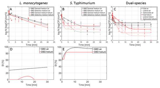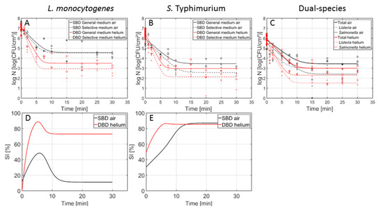 Cell density (log10 (CFU/cm2)) of the 7-day-old L. monocytogenes, S. Typhimurium, and dual-species model biofilms as function of the CAP treatment time using an air-based (black) or helium-operated (red) CAP system (n = 3). Both the experimental data (symbols) and the global fit (line) of the Geeraerd et al. [25] model are represented. For the single-species (A) L. monocytogenes and (B) S. Typhimurium biofilms: total viable population on general medium (o, solid line) and uninjured viable population on selective medium (x, dashed line). For the (C) dual-species biofilm: total population on general medium (o, solid line), L. monocytogenes population on PALCAM medium (x, dash-dot line), and S. Typhimurium population on XLD medium (◊, dashed line). The percentage of sub-lethally injured cells (SI) as function of the CAP treatment time have been included as well for the (D) L. monocytogenes and (E) S. Typhimurium single-species model biofilms using an air-based (black) or helium-operated (red) CAP system.