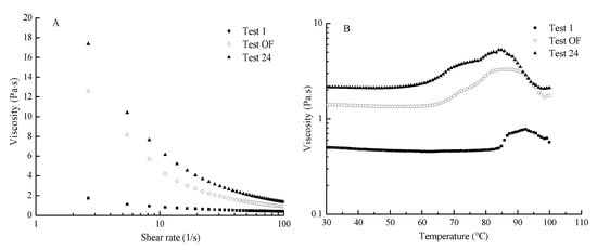 The optimum formulations (Test OF, at a viscosity of 1.374 Pa·s), Test 1 (at the lowest viscosity of 0.483 Pa·s), and Test 24 (at the highest viscosity of 2.058 Pa·s) were prepared as previously described (40 °C). All rheological measurements were performed using an AR-G2 rheometer (AR-1000, Co., TA, USA) with a stainless-steel plate (60 mm in diameter). The gap between the two plates was set to 1000 μm. The shear rate was ramped from 0.1 to 500 s−1 at 40 °C for 10 min to determine the flow behavior. Temperature sweep tests were performed from 30 to 95 °C at a scan rate of 5 °C/min and a shear rate of 50 s−1. Dynamic viscoelastic properties were characterized at the small amplitude oscillatory frequency sweep mode. The frequency was oscillated from 0.1 to 100 rad/s at 40 °C, and measurements were performed within the identified linear viscoelastic region and at a 0.5% strain [31]. Elastic modulus (G′) and loss modulus (G″) were recorded. Data were reported as the average of three replicates.