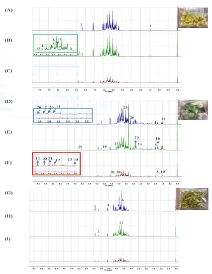 The 1H NMR were implemented following reported method using 500 MHz Varian INOVA NMR spectrometer (Varian Inc, Palo Alto, CA, USA) functioning at temperature of 26 °C with frequency of 499.887 MHz [16]. Each 1H NMR spectrum acquired a width of 20 ppm, which consisted of 64 scans with a 3.53 min acquisition time. For each sample, a relaxation delay of 1.0 s was recorded. The preparation procedure was done by weighing 10 mg of crude extract and placed in a 1 mL Eppendorf tube. Then, 375 µL of CD3OD and the same volume of KH2PO4 buffer in D2O (pH 6.0) containing 0.1% TSP were added. The TSP was used as internal reference, TSP = 0.0 ppm. The mixture was then vortexed for 1 min followed by 10 min of ultra-sonication. Next, the mixture was centrifuged at 130× g for 10 min to obtain a clear supernatant. A volume of 600 µL of the supernatant was transferred to NMR tube and subjected to 1H NMR analysis. All the NMR tubes were labeled and subjected to 1H NMR measurements using a predetermined setting for all the samples.