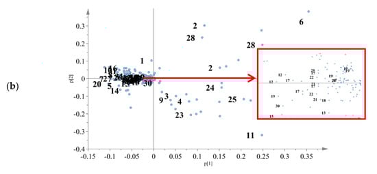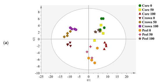 Based on the score plot, MD2 pineapple crown extracts were well clustered and clearly separated from peel and core extracts by PC1 (Figure 3a). Meanwhile, crown extracted with 50% and 100% ethanol were clearly distinguishable from crown extracted with a 0% ethanol by PC2. Peel extracted with a 100% ethanol was well clustered and separated from the 50% and 0% ethanol ratio peel extracts by PC2. Among the core extracts, the 100% ethanol showed good cluster, distinguishing them from the 50% and 0% ethanol ratios of core extracts by PC2. Compared to the 100% ethanol extracts, core and peel extracts from 50% and 0% were more dispersed and less clustered.