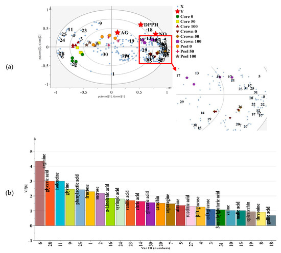 (a) The PLS biplot describing the correlation of MD2 pineapple peel, crown and core extracted with 0, 50 and 100% ethanol ratio and biological activities. See Table 1 for the assignments of metabolites. (b) Metabolites with variable importance in the projection (VIP) value ≥ 0.7 identified from MD2 pineapple peel, crown and core extracted with 0, 50 and 100% ethanol ratio.