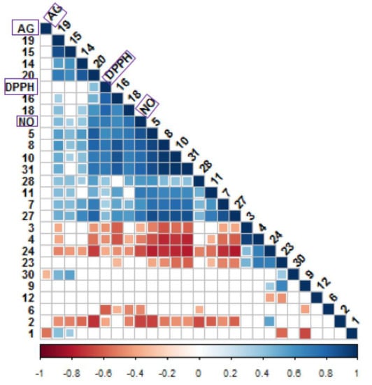 Correlogram visualizing correlation between metabolites analyzed using 1H NMR and biological activities. Correlation with p-value > 0.05 are considered insignificant and are represented by the blank white space. Color and size of the squares are proportional to the correlation coefficients. Positive correlations are shown in blue (different shades; dark blue with the strongest correlation) whereas negative correlations in red (ranging from light red to red; dark red with the weakest correlation). Assignment of metabolites: 1, fructose; 2, sucrose; 3, α-D-glucose; 4, β-D-glucose;6, arginine; 5, alanine; 7, asparagine; 8, threonine; 9, glycine; 10, valine; 11, isoleucine; 12, phenylalanine; 13, tryptophan; 14, citric acid; 15, malic acid; 14, citric acid; 15, malic acid; 16, α-linolenic acid; 17, ferulic acid; 18, gallic acid; 19, epicatechin; 20, catechin; 23, vanillic acid; 24, syringic acid; 27, succinic acid; 28, glyceric acid; 31, 3-methylglucaric acid.