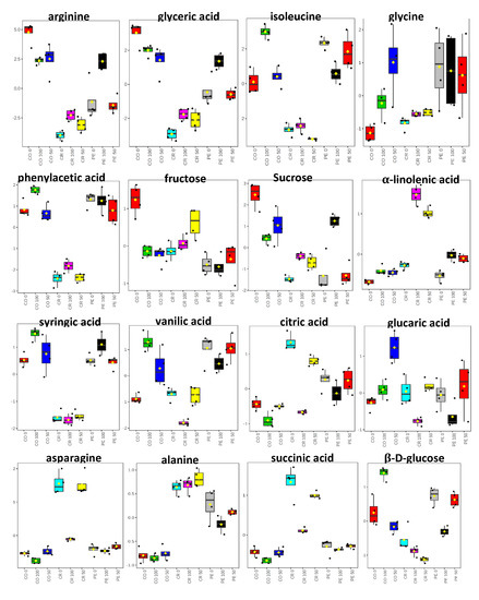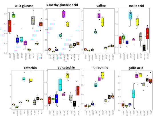 Boxplots of tentatively identified metabolites showing their relative quantification associated with MD2 pineapple waste extracts using 1H NMR spectra binned data. The metabolites are those with variable importance in the projection (VIP) value >0.7 of MD2 pineapple extracted with 0, 50 and 100% ethanol ratio Waste extracts are prepared from CO = core; CR = crown and PL = peel.