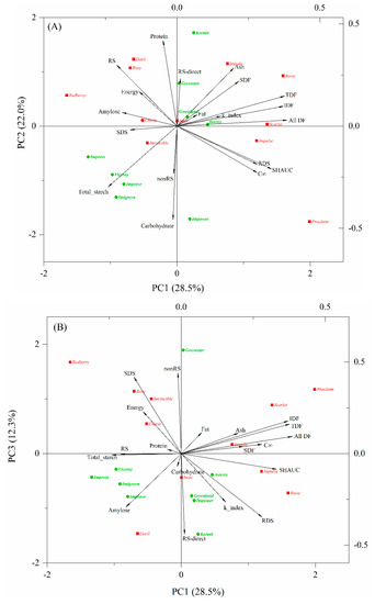 Biplot of the principal component analysis PC1 vs. PC2 (A) and PC1 vs. PC3 (B), describing the scores and variation in chemical and nutritional properties of cooked lentils. Abbreviations: SDF, IDF, TDF, and All_DF, soluble, insoluble, total and all dietary fibers, respectively; RDS, SDS and RS, rapidly digestible, slowly digestible and resistant starch, respectively, measured as outlined by Englyst et al.; nonRS and RS_kit, nonresistant and resistant starch, respectively, measured by Megazyme resistant starch kit; C∞, maximum hydrolysis extent; k_index, kinetic constant; SHAUC, the area under the in vitro starch hydrolysis curve.