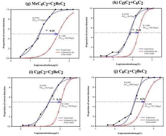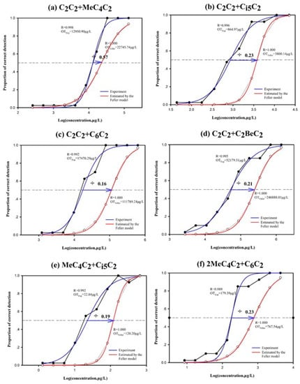 The detection probabilities calculated using Feller’s addition model were lower than the actual detection probabilities that were obtained by the experiment (Figure 1), when ethyl acetate and ethyl 2-methylbutyrate were mixed (Figure 1a) (p = 0.057). An additive interaction occurred. A synergistic interaction occurred when: ethyl acetate and ethyl 3-methyl butyrate were mixed (Figure 1b) (p = 0.024), ethyl acetate and ethyl hexanoate were mixed (Figure 1c) (p = 0.011), ethyl acetate and ethyl phenylacetate were mixed (Figure 1d) (p = 0.005), ethyl 2-methylbutyrate and ethyl 3-methyl butyrate were mixed (Figure 1e) (p = 0.020), ethyl 2-methylbutyrate and ethyl hexanoate were mixed (Figure 1f) (p = 0.016), ethyl 2-methylbutyrate and ethyl phenylacetate were mixed (Figure 1g) (p = 0.002), ethyl 3-methyl butyrate and ethyl hexanoate were mixed (Figure 1h) (p = 0.016), ethyl 3-methyl butyrate and ethyl phenylacetate were mixed (Figure 1i) (p = 0.016), and when ethyl hexanoate and ethyl phenylacetate were mixed (Figure 1j) (p = 0.014). Cometto-Muñiz et al. [27] investigated the olfactory detectability of ethyl propionate and ethyl heptanoate, and measured the concentration detection (i.e., psychometric) function of individual and mixture odours at different concentrations. The results showed that the mixture approaches the response-addition model at low detection levels, i.e., the independence of the assay, while they approach the dose-addition model at a high detection level.