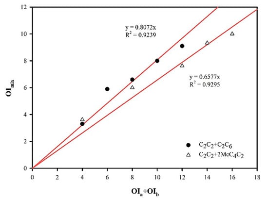 In general, different odour mixtures had different values of cosα, which were usually based on experience to determine the components with equal perceptual intensity and they were used to predict the OI of the remaining mixtures in a group. For special cases where the perceptual intensities of the two odour components were equal, Equation (6) can be rewritten, i.e., OIa = OIb, and the following equation applies [18]: