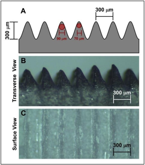 The manufactured mold is shown in Figure 1B,C. The microchannel width and height were both 300 µm. This microstructure was very similar to the proposed theoretical design and was adequate enough to grow parallel muscle fiber.
