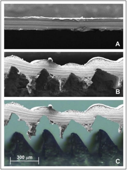 Microscopy of the films (scale bar 300 µm). (A) Scanning electron microscopy (SEM) image of the flat film. (B) SEM image of the microstructured film. (C) Photomontage between an optical image of the microstructured mold and a SEM image of the microstructured film.
