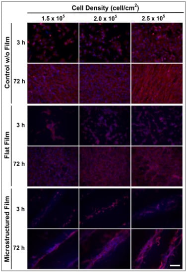 Epifluorescence microscopy of cells cultured on flat and microstructured films. Red color shows actin with rhodamine-phalloidin staining. Blue color shows cell nuclei with Hoechst staining. Scale bar 100 µm.