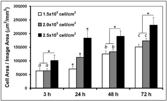 Spreading of muscle cells cultured on microstructured films. Asterisk (*) shows significant difference (p < 0.05; ANOVA; n = 10). Bars with same letter indicate no significant difference between them (p > 0.05; Tukey’s test; n = 10).