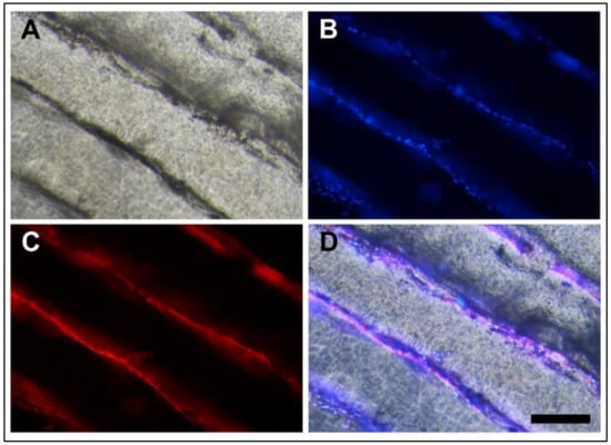 Optical/epifluorescence microscopy of fibers on microchannels after medium change (scale bar 200 µm). (A) Optical microscopy image. (B) Epifluorescence microscopy using Hoechst staining (blue shows cell nuclei). (C) Epifluorescence microscopy using rhodamine-phalloidin staining (red shows actin). (D) Merge of the microscopy images.
