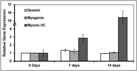 The gene expressions of desmin, myogenin, and conventional myosin heavy chain class II were quantified using RT-qPCR. Desmin, myogenin, and myosin heavy chain are biomarkers of early, intermediate, and late myogenic differentiation, respectively [21].