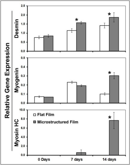 Figure 7 shows the expression of desmin, myogenin, and myosin heavy chain in the flat film and microstructured film. At day zero, the expression of desmin and myosin by the cells cultured on flat and micrustructured films did not show significant differences (p > 0.05; t-test). Cells on both film types did not express myosin heavy chain at day zero, indicating the typical behavior of non-differentiated myoblasts [21,31].