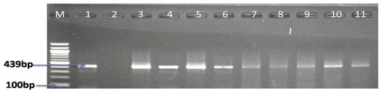 Agarose gel electrophoresis image of PCR-confirmed genus Campylobacter. Lane M: molecular marker (100 bp); lane 1: positive control (C. jejuni ATCC 33560); lane 2: negative control; and lanes 3−11: positive Campylobacter isolates (439 bp).