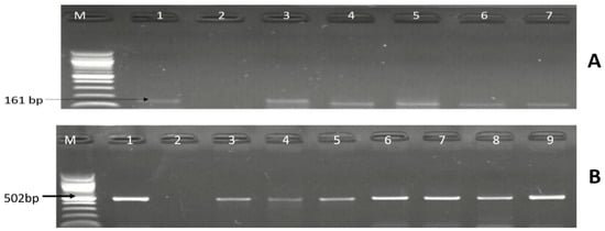 Gel (A) is a representative gel electrophoresis image of PCR-confirmed C. jejuni. Lane M: DNA ladder (100 bp); lane 1: positive control (C. jejuni ATCC 33560); lane 2: negative control; lanes 3–7: positive C. jejuni isolates (161 bp); and (B) is a representative gel image of PCR-confirmed C. coli. Lane M: DNA ladder (100 bp); lane 1: positive control (C. coli ATCC 33559); lane 2: negative control; and lane 3–9: positive C. coli isolates (502 bp).