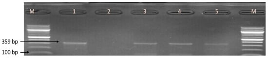 Gel picture of some PCR-identified C. fetus. Lane M: molecular weight marker (100 bp); lane 1: positive control (C. fetus ATCC 27374); lane 2: negative control; lanes 3–5: positive C. fetus isolates (359 bp).