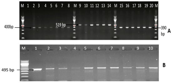 Image (A) is a representative gel picture of the PCR-confirmed cadF, iam, and flgR genes. Lane M: molecular marker (100 bp); lane 1: negative control; lanes 2–8: positive Campylobacter isolates that harboured the cadF gene (400 bp); lanes 9–14: positive Campylobacter isolates that harboured the iam gene (519 bp); lanes 15–20: positive Campylobacter isolates that harboured the flgR gene (390 bp); and (B) is a gel image of the PCR-confirmed cdtB gene. Lane M: DNA ladder (100bp); lanes 1–10: positive Campylobacter isolates that harboured the cdtB gene (495 bp).