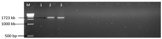 Gel image of the PCR-confirmed flaA gene. Lane M: DNA ladder (1 kb); lane 1: negative control; lanes 2–3: positive Campylobacter isolates that harboured the flaA gene (1723 kb).