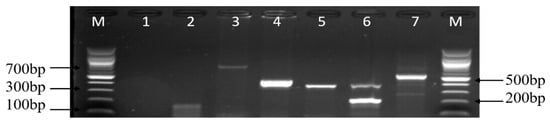 A representative gel image of various amplified antimicrobial resistance genes of Campylobacter isolates. Lanes M: DNA ladder (100 bp); lane 1: negative control; lane 2: tetM gene (158 bp); lane 3: aac(3)-IIa (aacC2)a gene (740 bp); lane 4: gyrA gene (441 bp); lane 5: ermB gene (320 bp); lane 6: tetA gene (201 bp) and tetB gene (359 bp); and lane 7: ampC gene (530 bp).